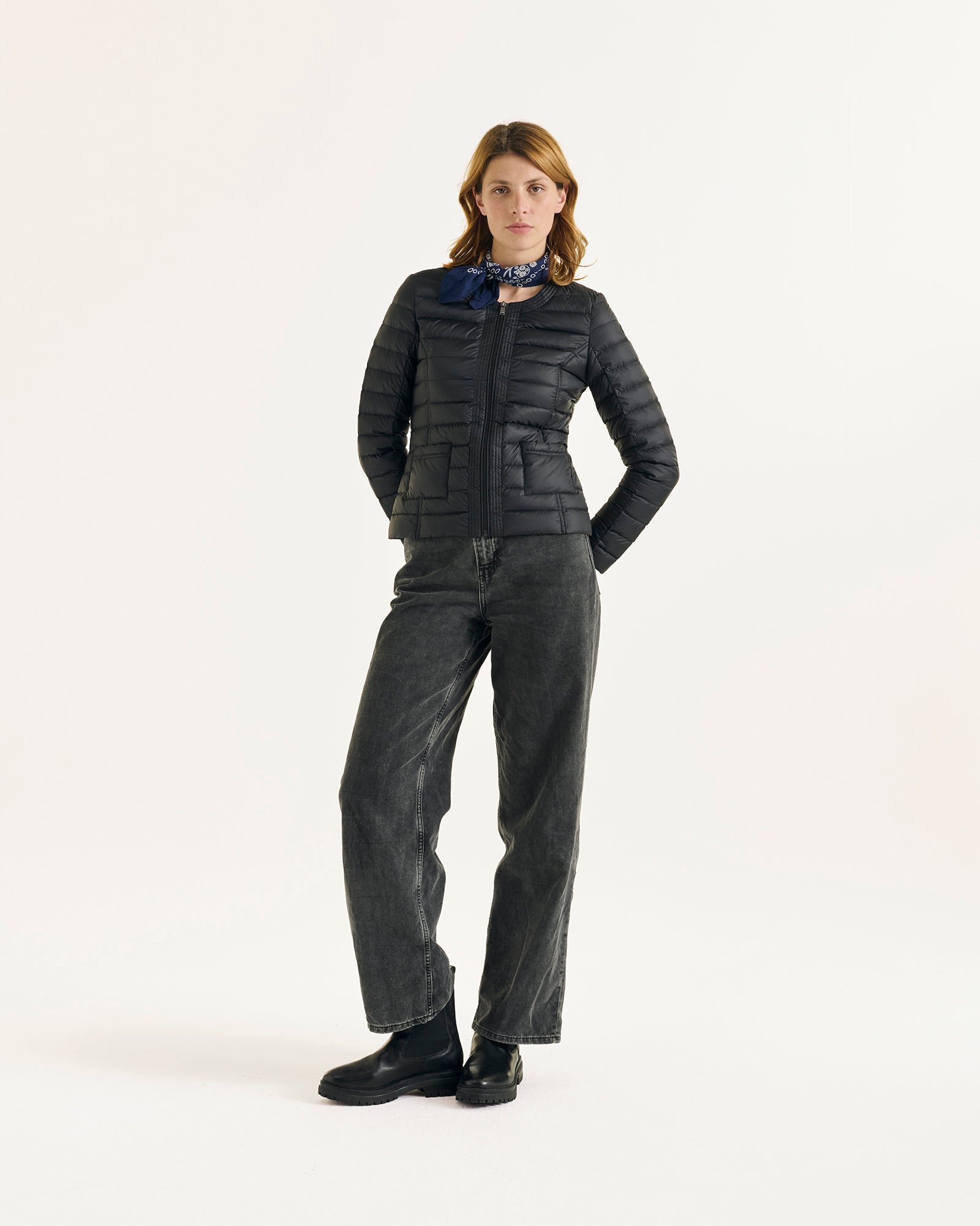 DOUDA de JOTT, c’est tout l’esprit du tailleur incarné dans une doudoune légère et féminine. Le coupe ajustée soulignant la taille, l’encolure dégagée surpiquée et les petites poches plaquées font de cette veste une véritable pièce de mode élégante. Elle est également pratique puisque pochonnable : une pièce à emporter partout !
