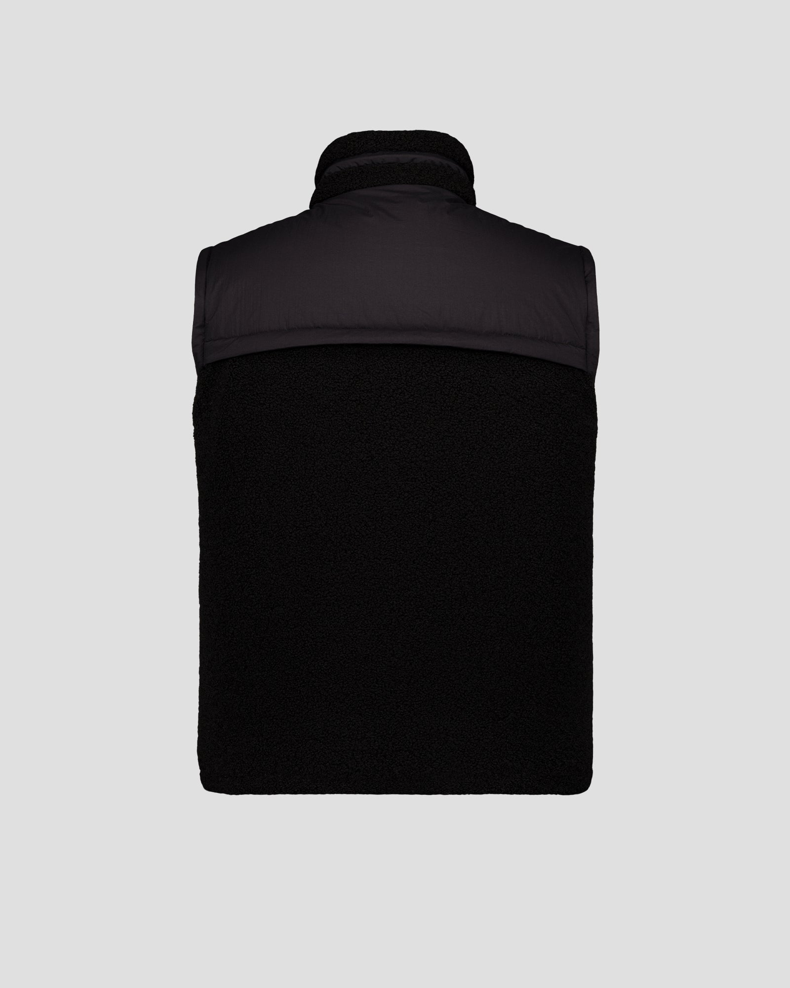 Doudoune hybride en sherpa et nylon mémoire de forme. Poches zippées contrastées, cordons colorés et manches amovibles pour une pièce modulable, confortable et pleine de style.